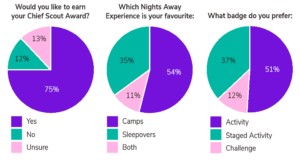 Every young person we saw answered these three questions, and over the past few months I have been shifting through the answers and bring together the results. Have a look at the results below! Personally I think it is amazing to see so many young people with desires to be sleeping outdoors and aiming for their top awards!